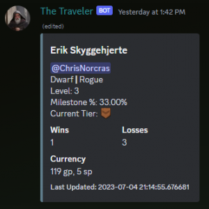 In addition to setting up our website, our custom Discord bot, The Traveler, is now complete and is tracking players’ progress in The Arena.